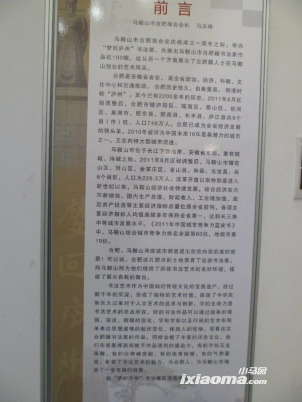 为庆祝马鞍山市合肥商会成立一周年,马鞍山市合肥商会特在图书馆展览厅举行长达一周的梦回庐州——合肥籍书法家作品展。作品展出近百副,得到了社会的广泛关注。